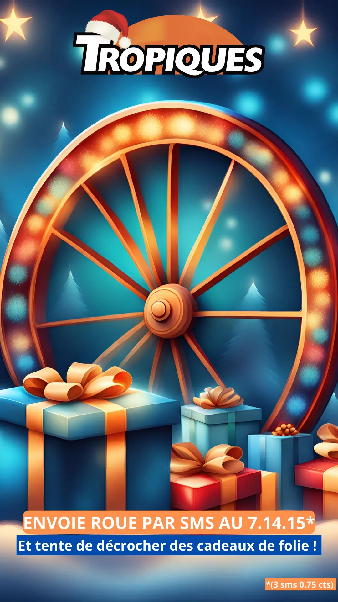 La participation au jeu sms « ROUE DES CADEAUX » implique l’acceptation entière et sans réserve du présent règlement. Il pourra être obtenu sur simple demande écrite à TROPIQUESFM, 20 Rue Troyon, 9310, SEVRES. Il sera consultable sur https://www.tropiquesfm.com